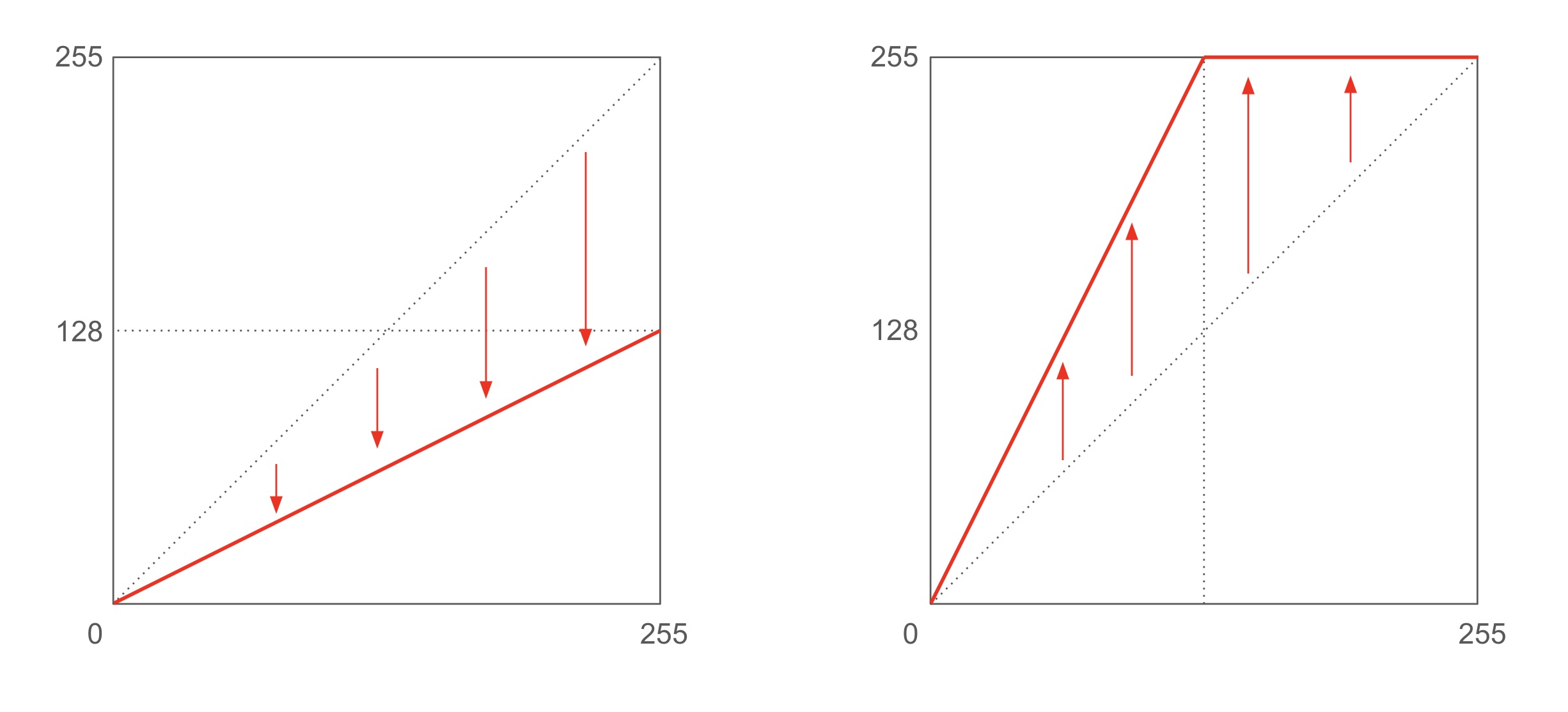 Adjusting the brightness of an image means increasing or decreasing the color value of each pixel by a certain amount. If you increase the brightness, the entire image becomes brighter, and if you decrease it, it becomes darker. At this time, you can implement it by adding or subtracting a certain constant to the RGB value of each pixel. In addition, if the brightness value increases or decreases to become less than 0 or more than 255, it must be processed under the conditions below. The reason is that the byte (unsigned char) data type can only use values from 0 to 255, so saturate(x) processing is required, but it is not required in the case of signed, as an exception.