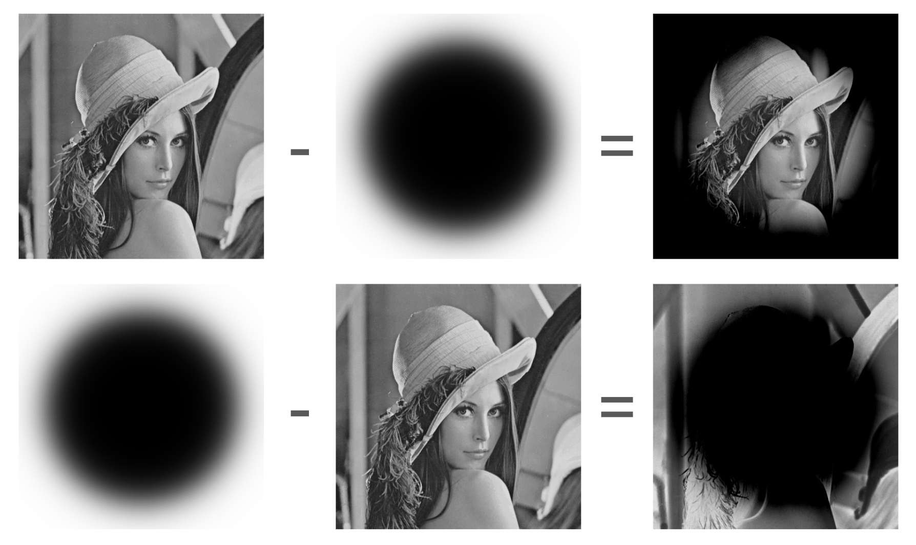 The subtraction operation between images can be used as image masking. An example that is often used in image processing is the method of masking a specific area using a gradient mask. A gradient mask is a mask in which pixel values gradually change from 0 to 255, which allows you to smoothly process certain areas of an image. To create a gradient mask, you can use the Sigmoid function to create a gradient, and then spread it in a circular shape to create a gradient mask image. If you perform a subtraction operation using the created gradient mask, you can see the result as shown below.