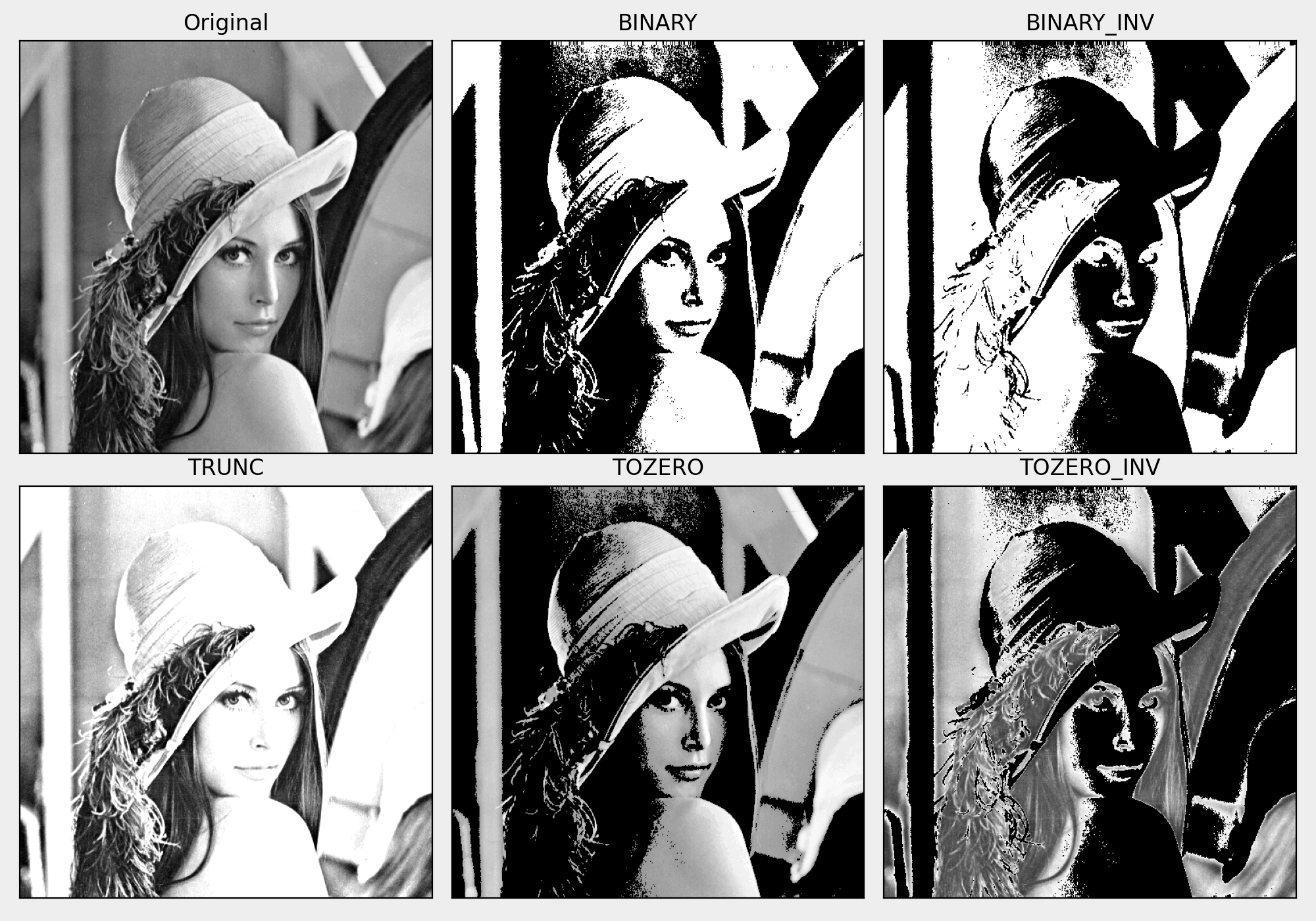 - cv2.THRESH_TRUNC: Set the value exceeding the threshold as the threshold, if it is smaller, keep it as is.