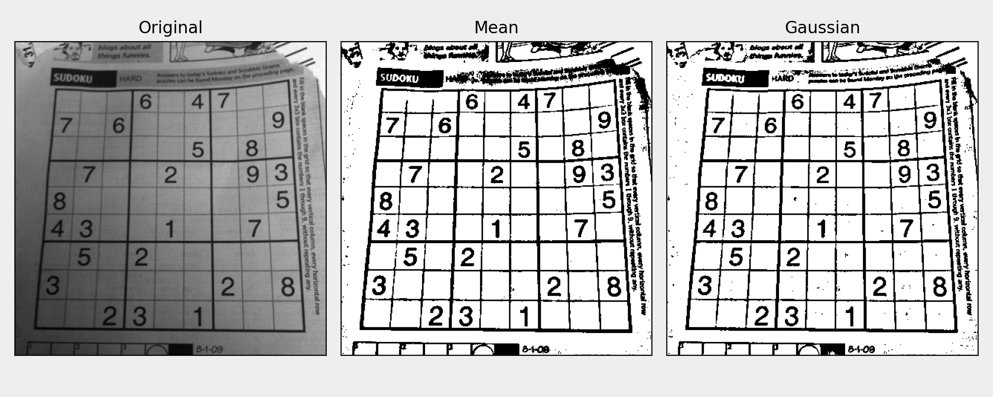 - adaptiveMethod: cv2.ADAPTIVE_THRESH_MEAN_C, cv2.ADAPTIVE_THRESH_GAUSSIAN_C.