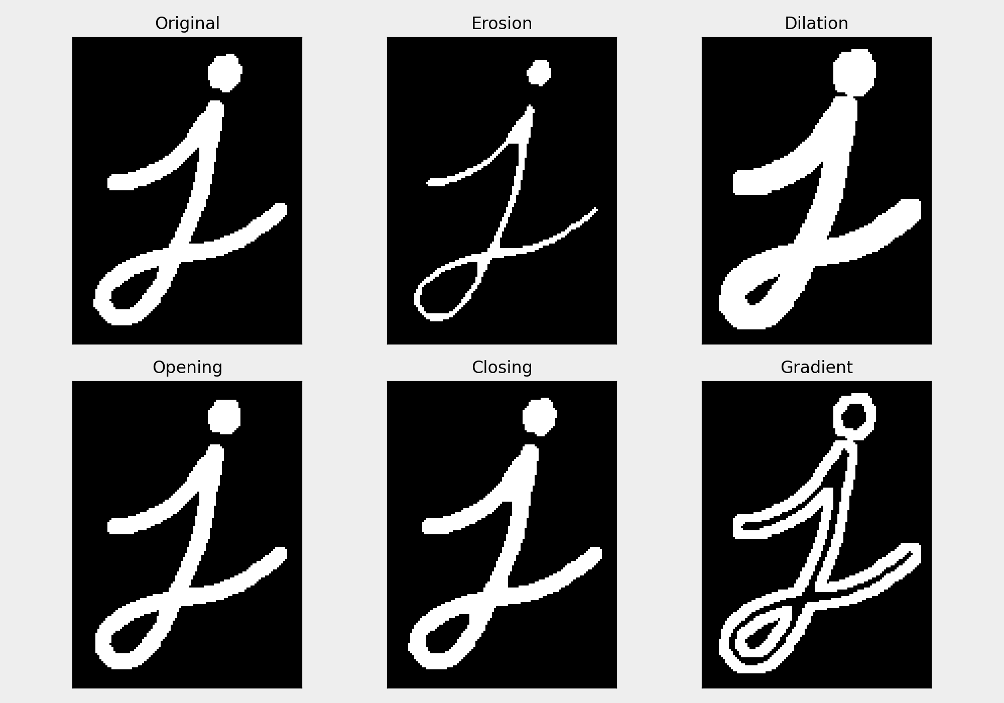 titles = ['Original', 'Erosion', 'Dilation', 'Opening', 'Closing', 'Gradient']