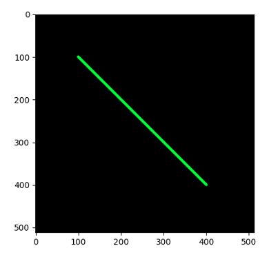 cv2.line(image, (100, 100), (400, 400), (0, 255, 0), 5)