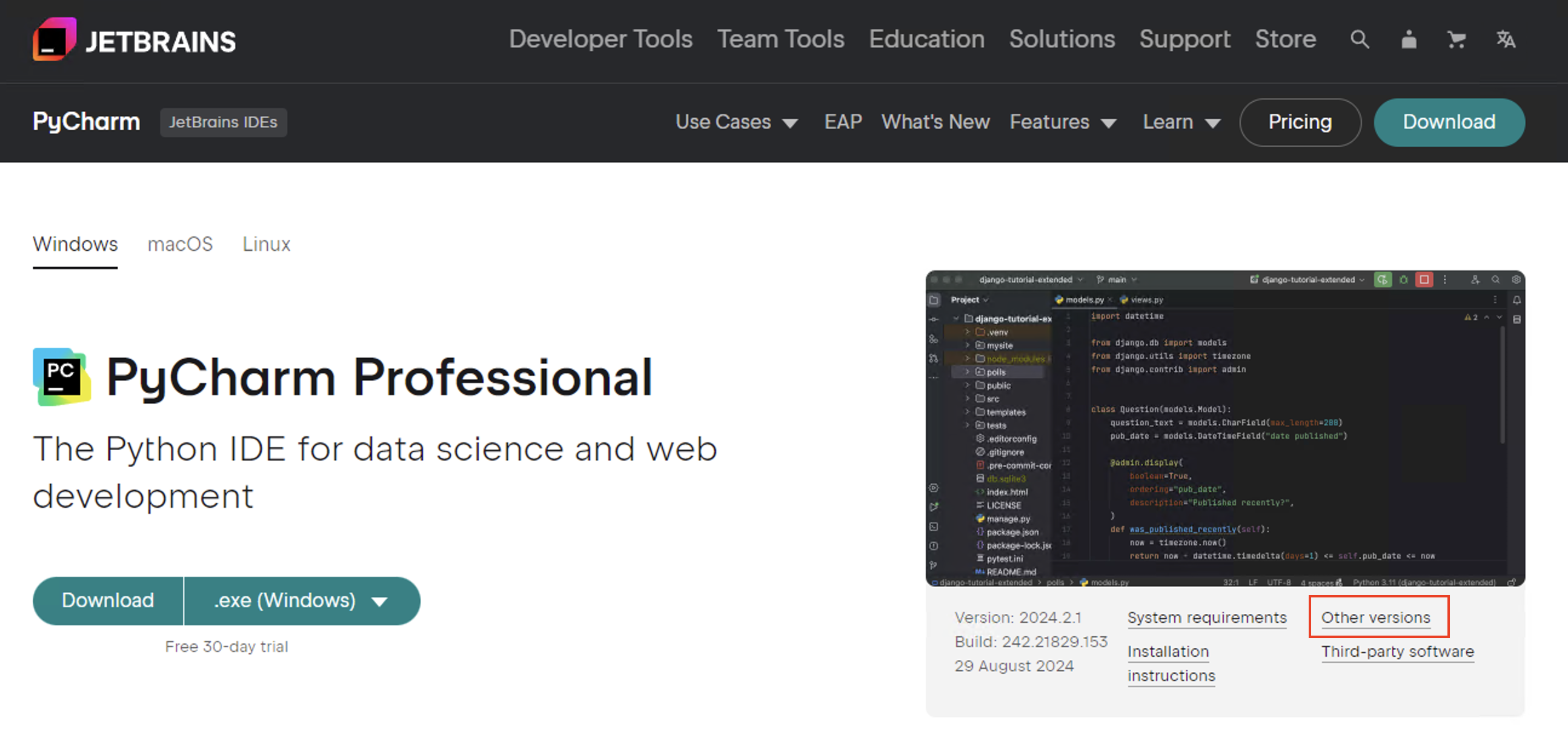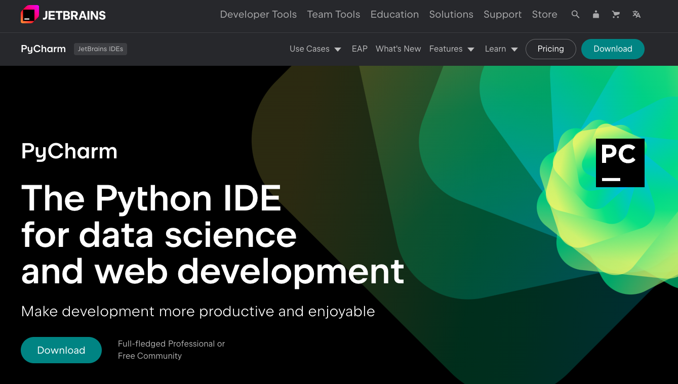 PyCharm has a free version, Community Edition, and a Professional Edition that provides paid features. For general Python development and learning purposes, the Community Edition is sufficient. Here's how to download it: