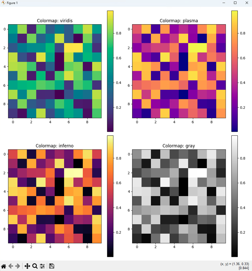 • You can set various colormaps using the cmap argument. In this example, we used viridis, plasma, inferno, and gray colormaps.